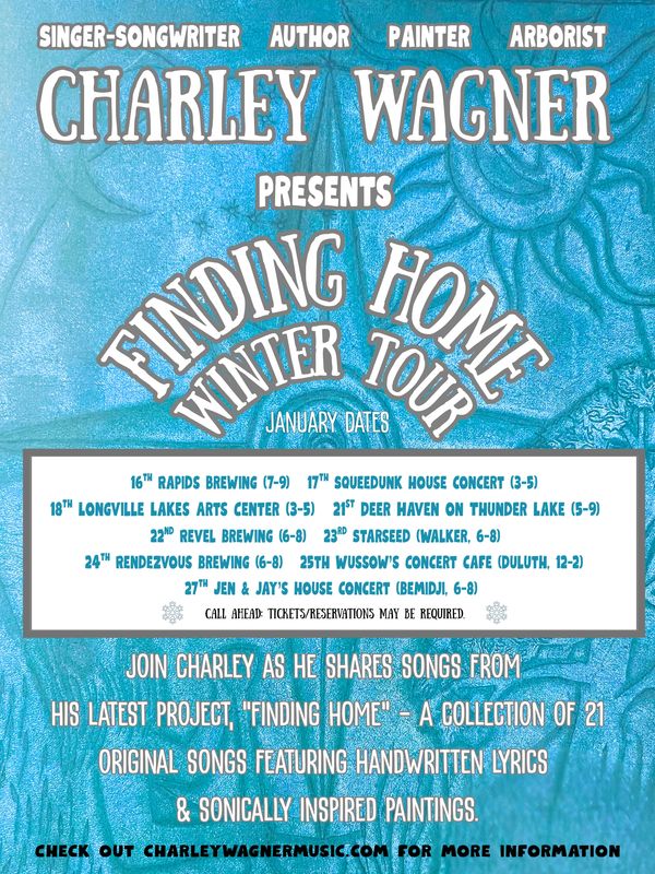 Charley Wagner is a singer/songwriter from the town of Longville in the Northwoods of Minnesota. Music and writing has been a passion and good friend since a young age. Working as an arborist most of his life, climbing trees around the world collecting stories and perspective he has decided to make his stories in song more of a priority. Creating original music that captures the human experience and reverence for nature, he hopes you find a connection. "A wise man once told me that the first half of your life you're living to learn, about mid life you make the switch to learning to live". So here we are.